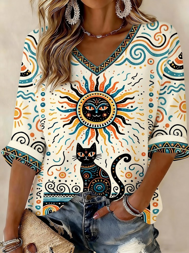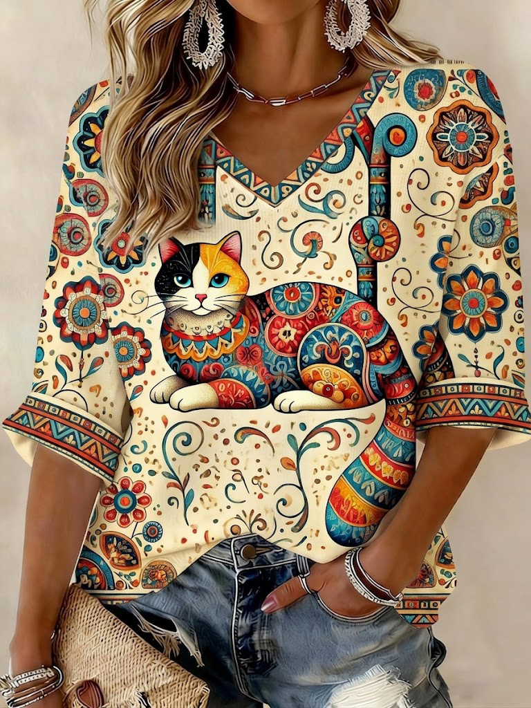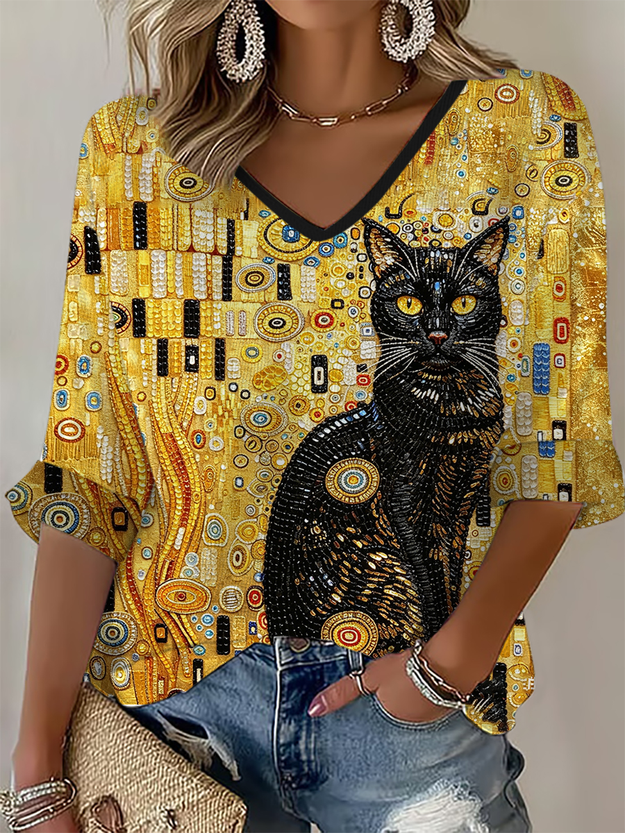 T-shirt da donna con stampa gatto, maniche a metà braccio e scollo a V
