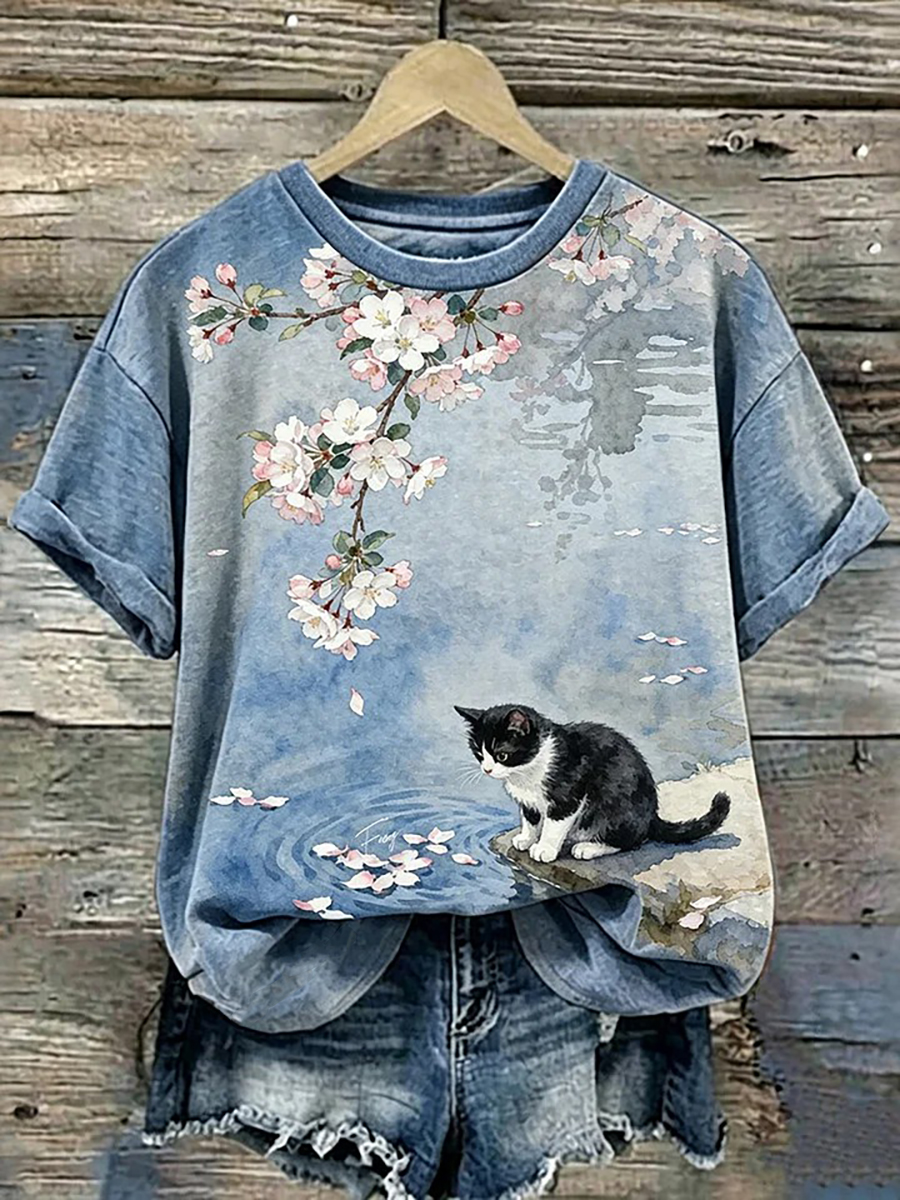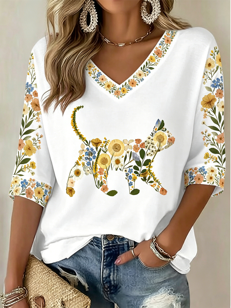 T-shirt casual da donna con stampa floreale e gatti
