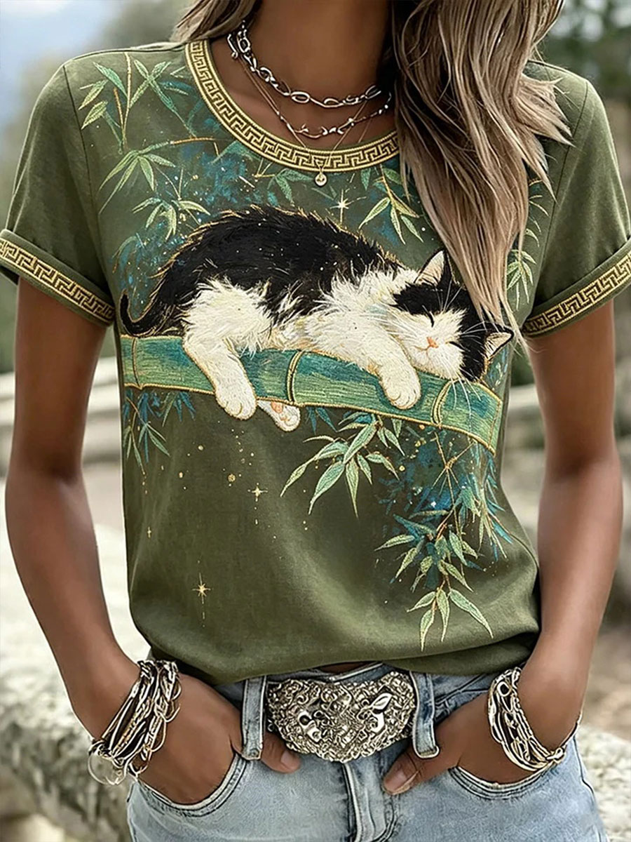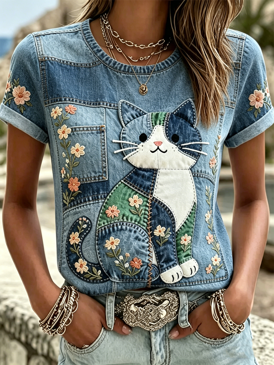 T-shirt casual da donna con ricamo e stampa di gatti e animali