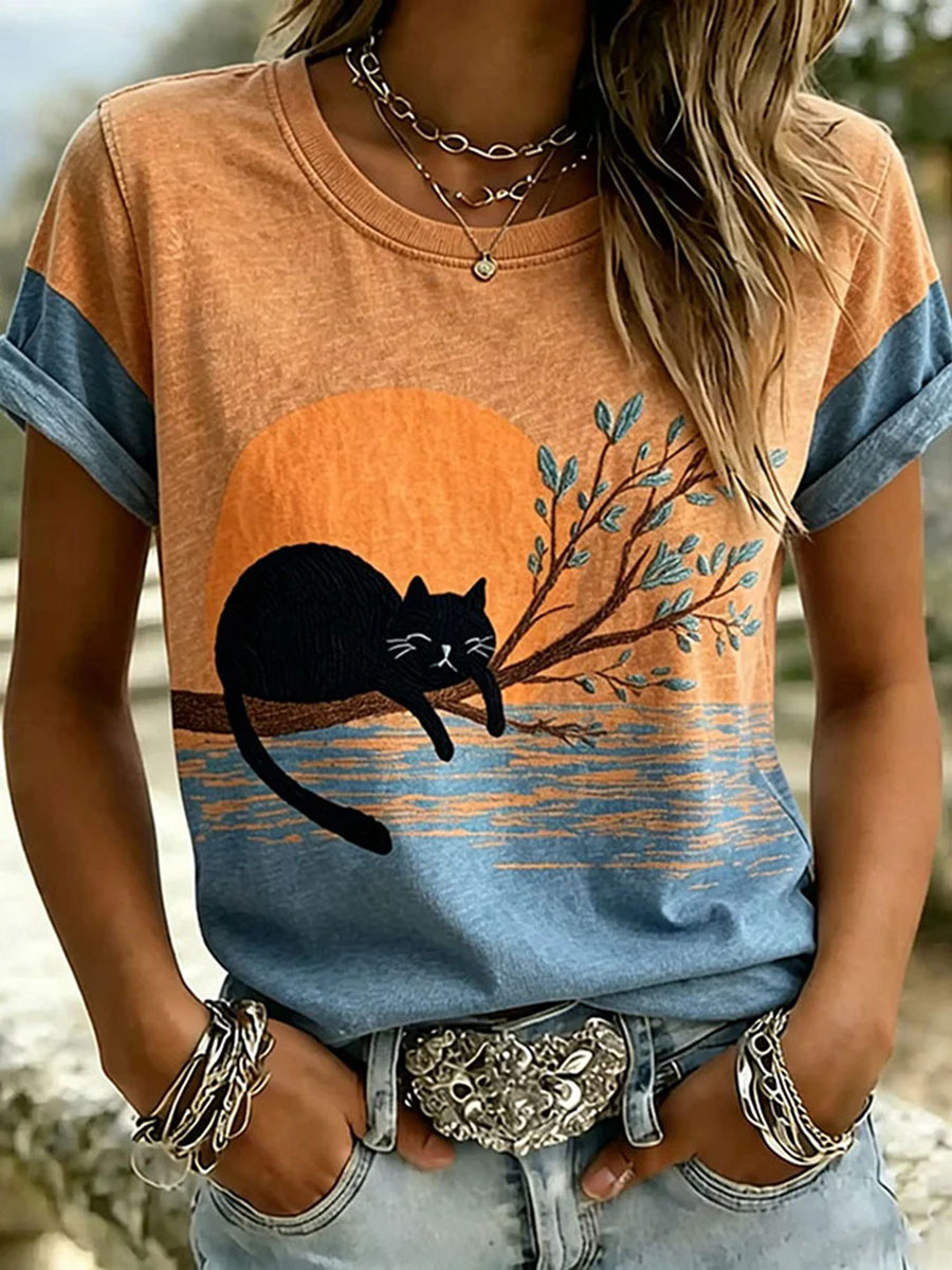 T-shirt casual da donna con stampa gatto